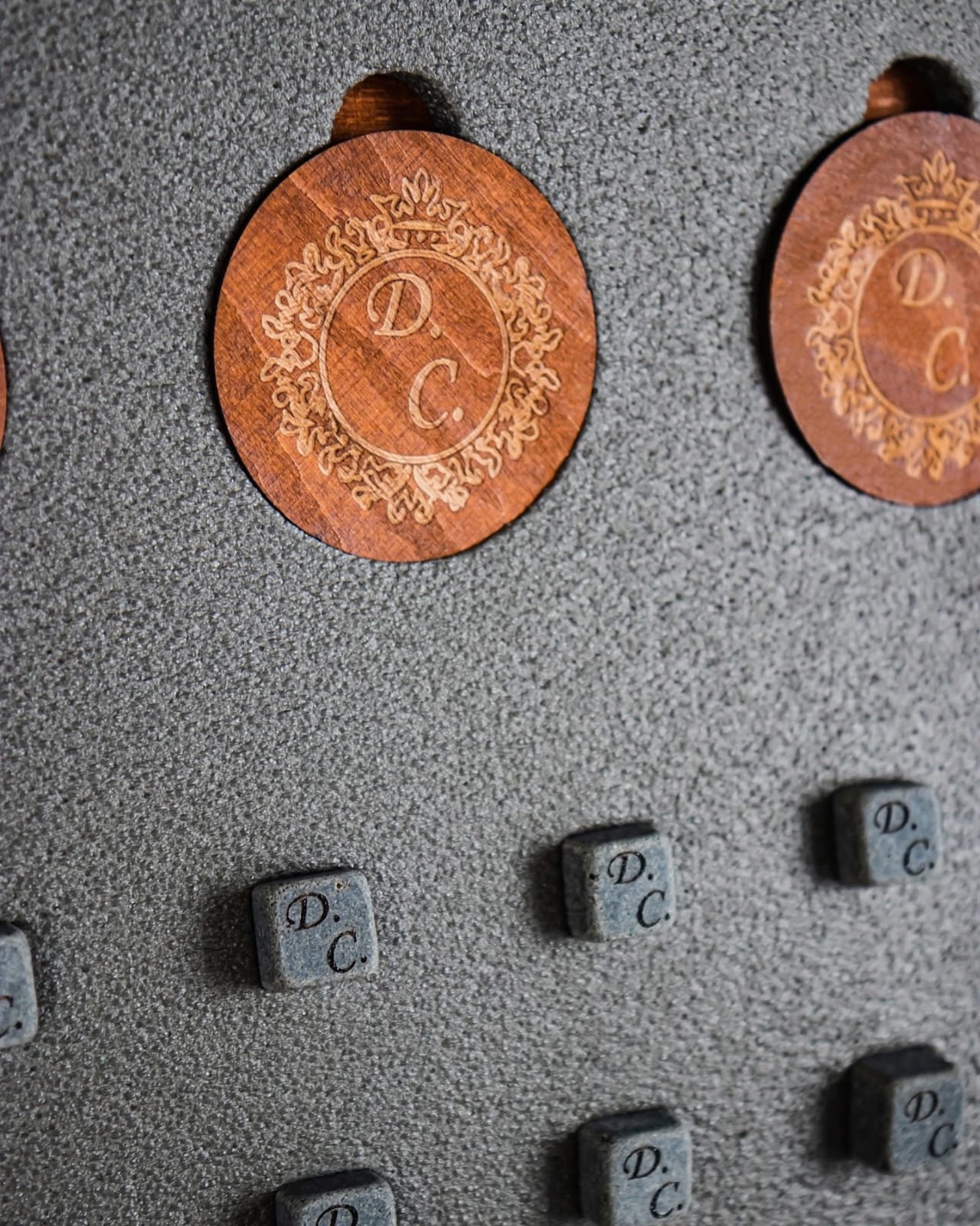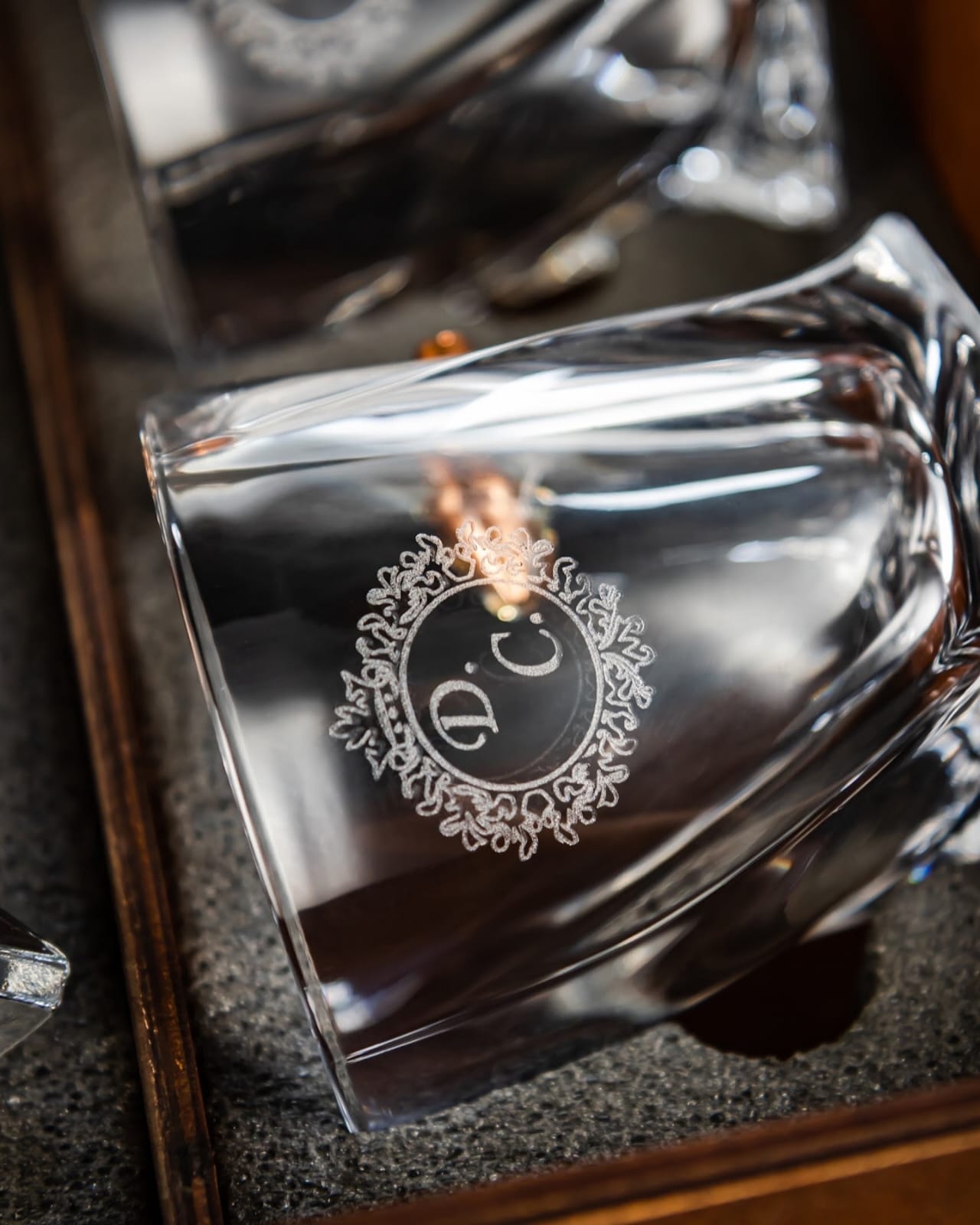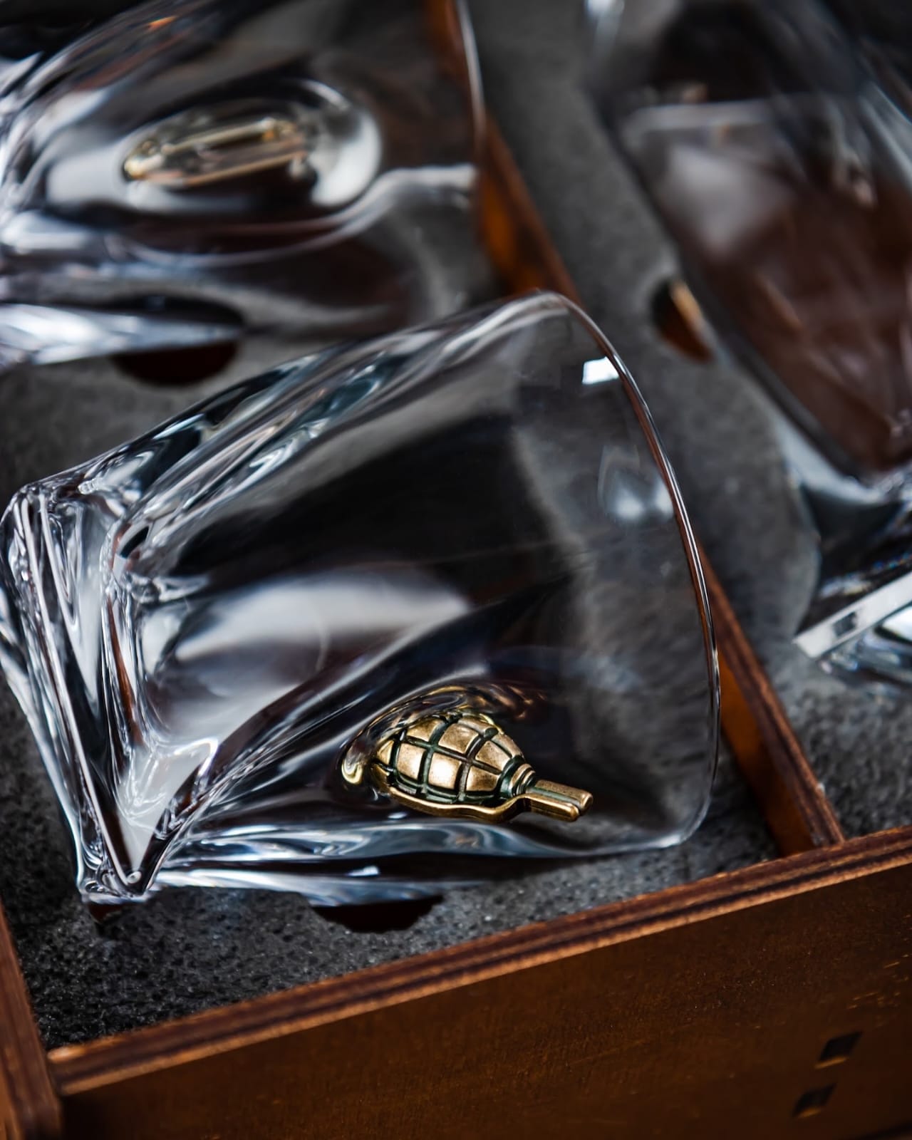 Este set organiza la barra con presencia y oficio. Una maleta de madera de formato amplio aloja seis vasos de cristal grueso intervenidos con insertos metálicos (combinación bala y escudo), montados y centrados a mano. La tapa integra 18 piedras de enfriado y seis posavasos ; el interior de espuma moldeada mantiene cada pieza firme. Producción mendocina, materiales sólidos y verificación pieza por pieza.