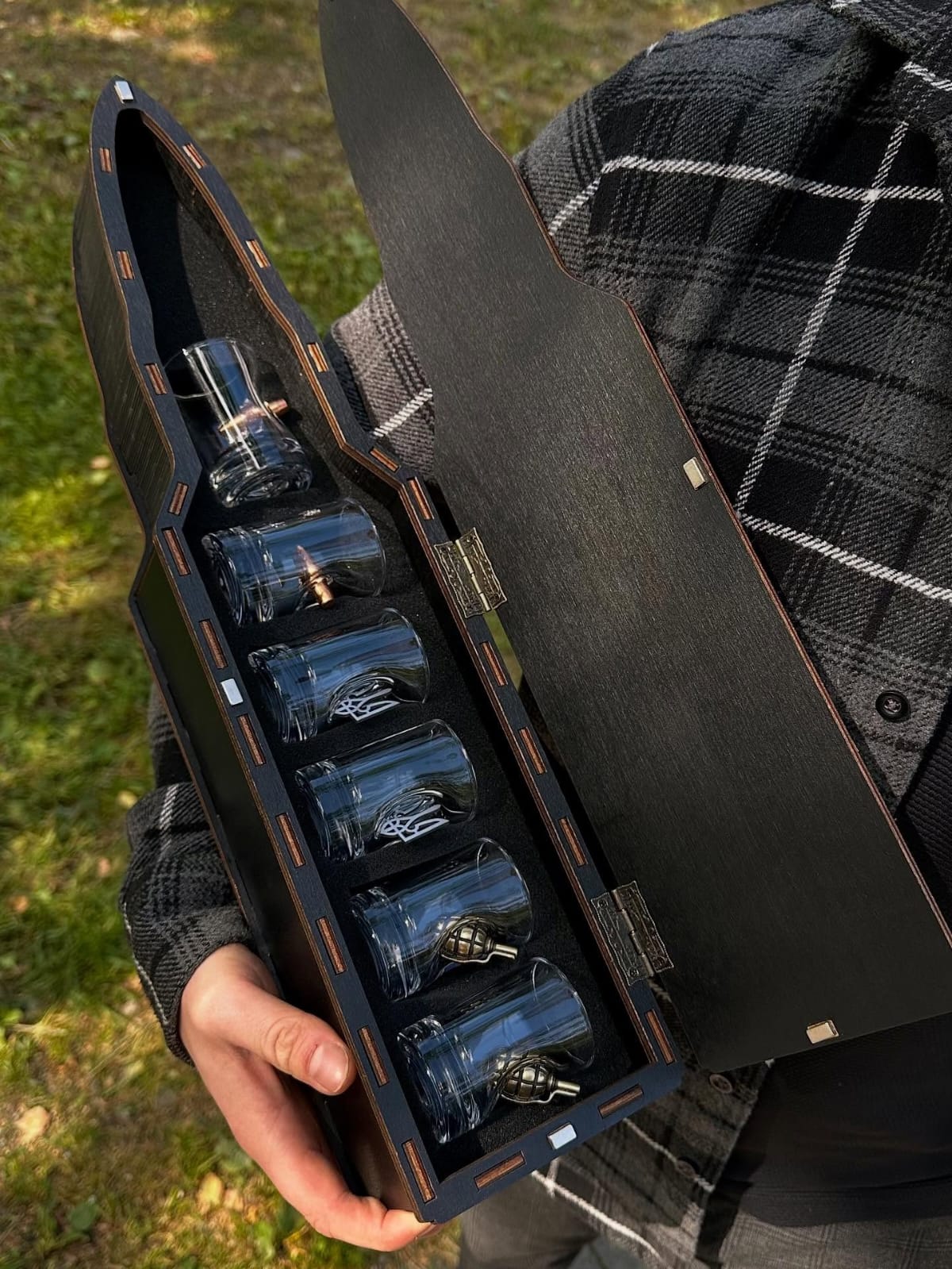 Este set ofrece presencia y carácter en un formato singular: una caja de madera con forma de bala que guarda seis vasos compactos de vidrio grueso, cada uno intervenido con insertos metálicos trabajados a mano (bala, granada y escudo). Terminación negra con filetes de cobre, bisagras reforzadas y cierre imantado. Producción mendocina con control pieza por pieza: materiales sólidos, geometría consistente y montaje manual centrado.