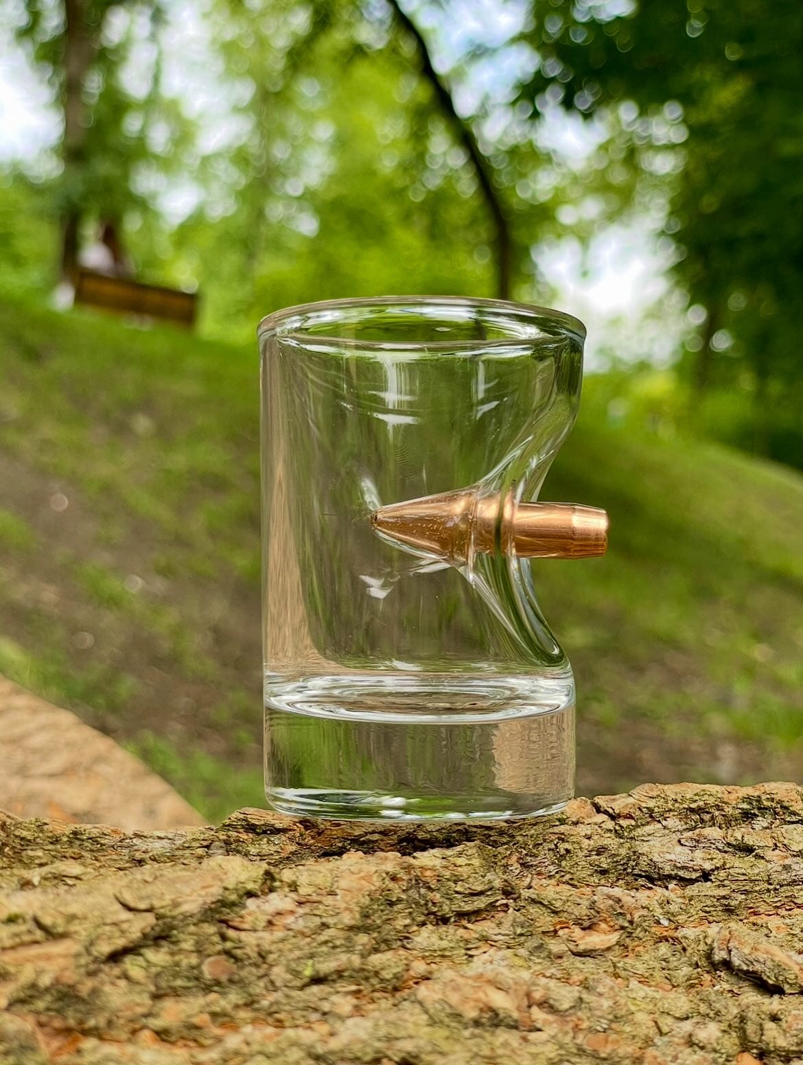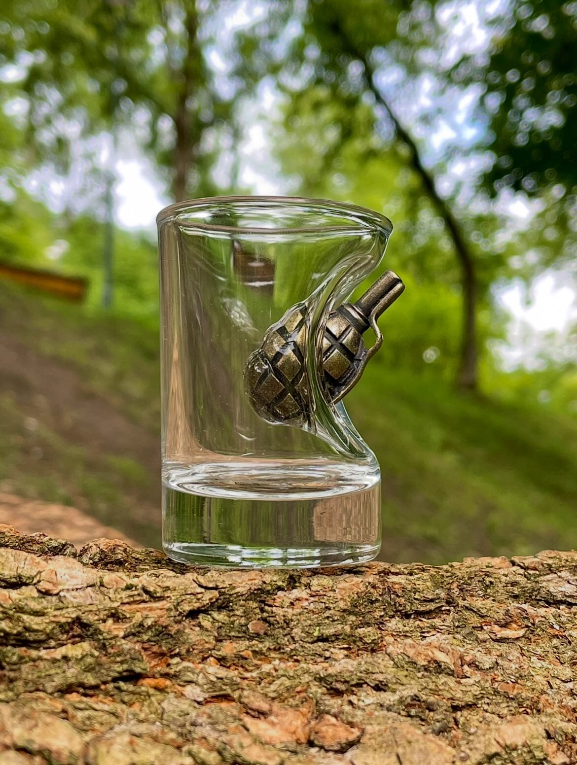 Los vasos y decanters son de vidrio/cristal de alta claridad. Los insertos (bala, granada, escudo, cereza, moneda, etc.) se fabrican en aleación metálica y se fijan de forma mecánica y sellada; cada pieza se centra y revisa manualmente.