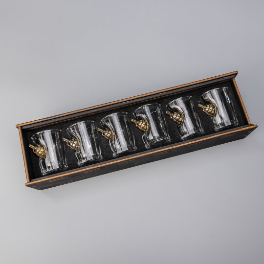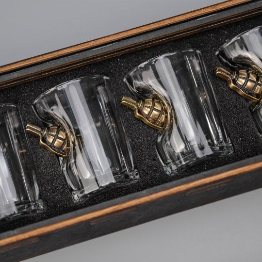 Los vasos y decanters son de vidrio/cristal de alta claridad. Los insertos (bala, granada, escudo, cereza, moneda, etc.) se fabrican en aleación metálica y se fijan de forma mecánica y sellada; cada pieza se centra y revisa manualmente.