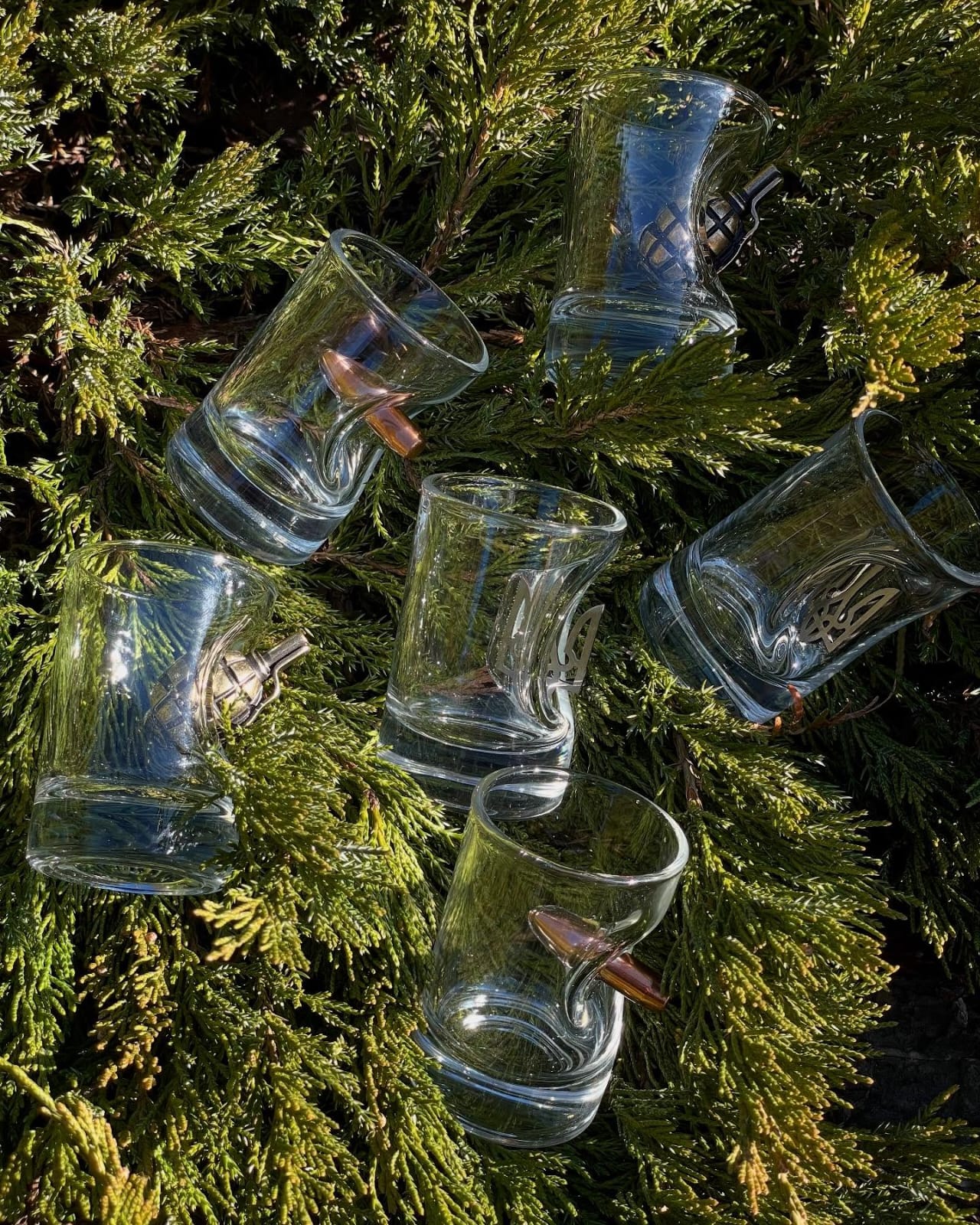 6 vasos con figuras metálicas (bala, granada, escudo), montadas y centradas a mano