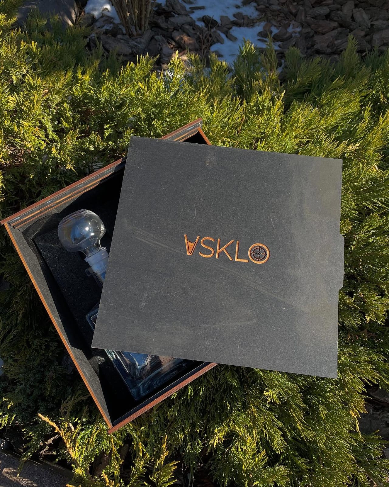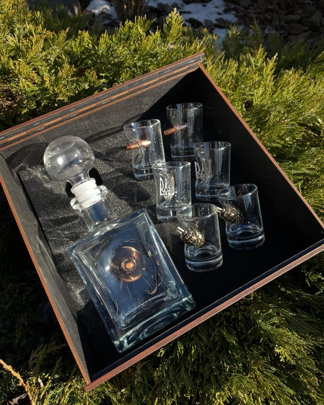 Este set combina presencia y control: un decanter cúbico y seis vasos de vidrio grueso, cada pieza intervenida con insertos metálicos trabajados a banco (bala, granada y escudo). La caja de madera en negro con logo VSKLO sostiene el estándar de taller mendocino: materiales sólidos, terminaciones prolijas y verificación pieza por pieza.